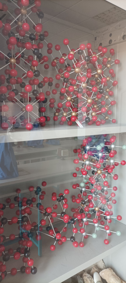 L’aula è provvista anche di un’ampia collezione di modellini in legno per lo studio delle classi e sistemi cristallini di minerali e di una collezione in metallo di Modelli reticolari.